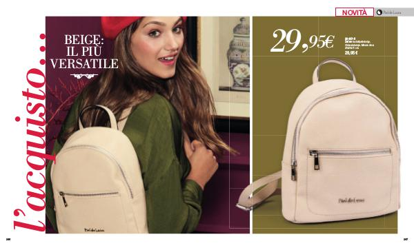 29, 95€ NOVITÀ 26447-5 Zaino in similpelle beige. Chiusura lampo. Misure circa: 25x24x11 cm. 29,95€ 133 247