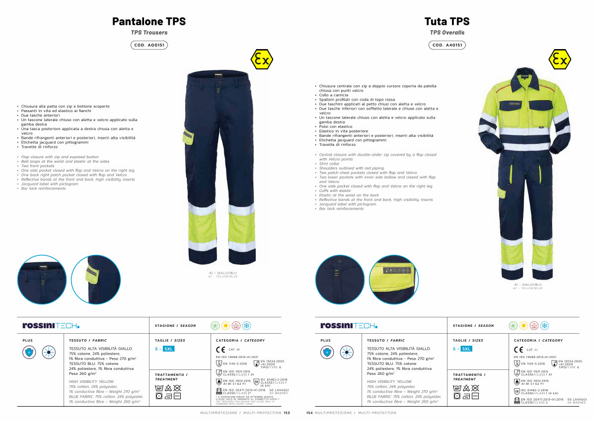 TESSUTO ALTA VISIBILITÀ GIALLO: 75 % cotone, 24 % poliestere, 1 % fibra conduttiva- Peso 270 g / m ² TESSUTO BLU: 75 % cotone 24 % poliestere, 1 % fibra conduttiva Peso 260 g / m ²
