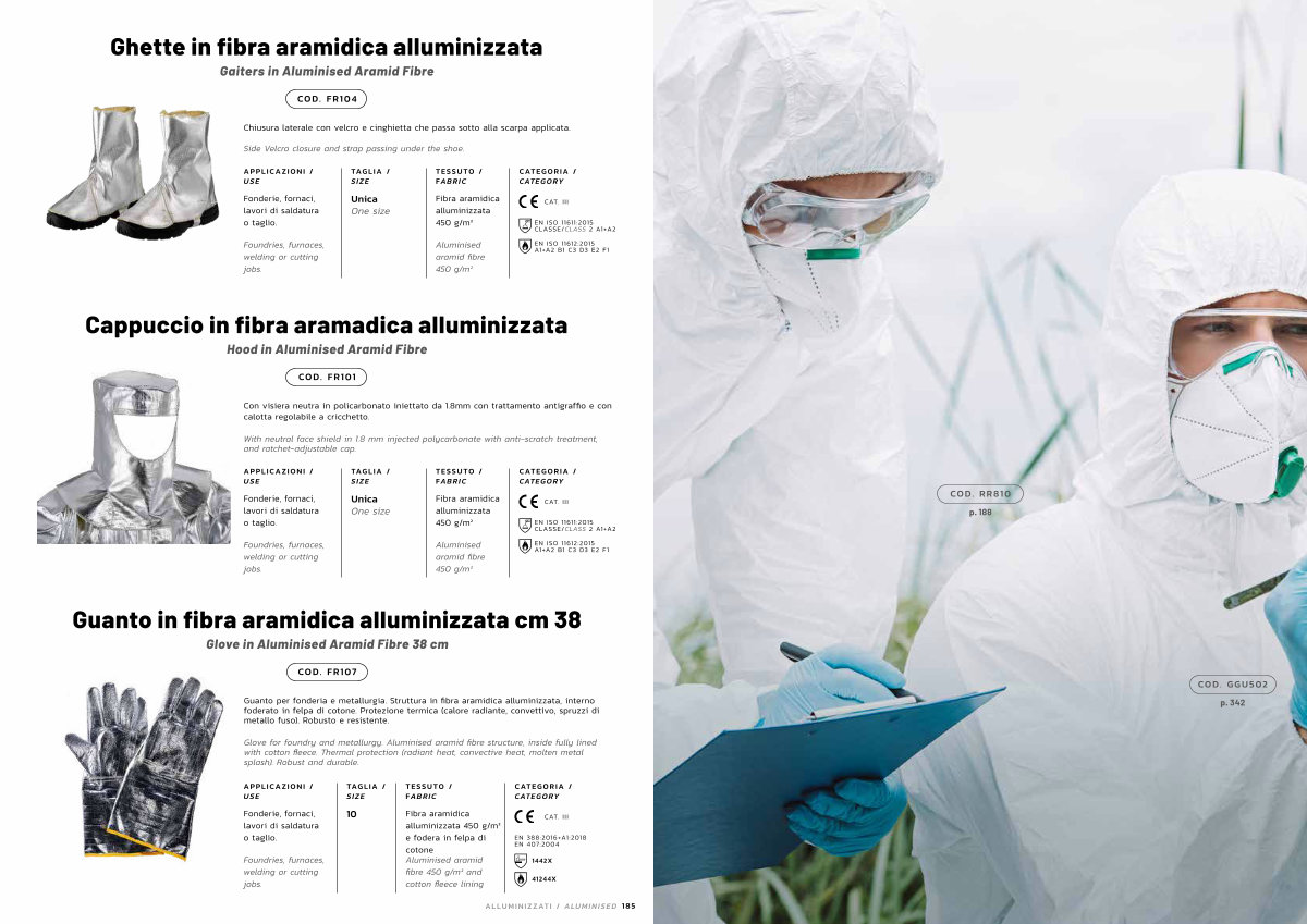 Guanto per fonderia e metallurgia. Struttura in fibra aramidica alluminizzata, interno foderato in felpa di cotone. Protezione termica( calore radiante, convettivo, spruzzi di metallo fuso). Robusto e resistente.