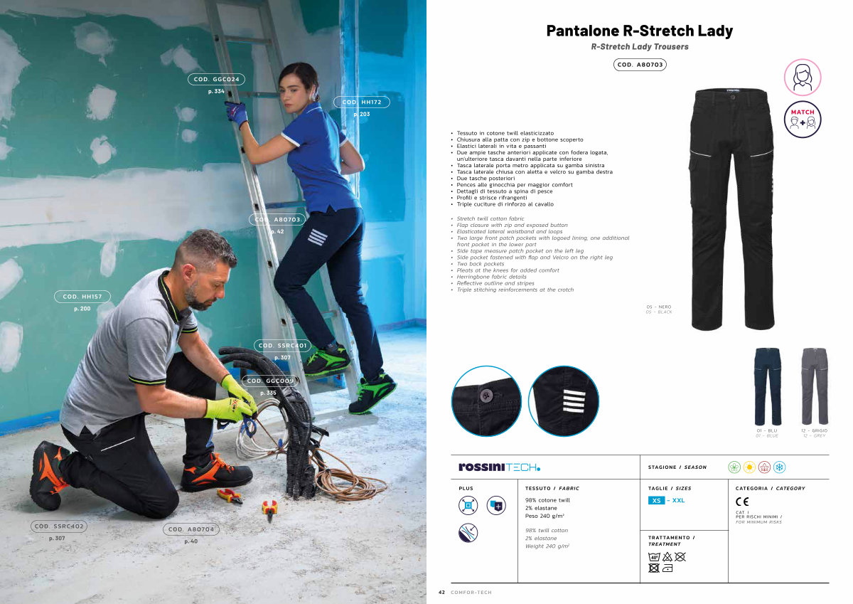 98 % cotone twill 2 % elastane Peso 240 g / m ²