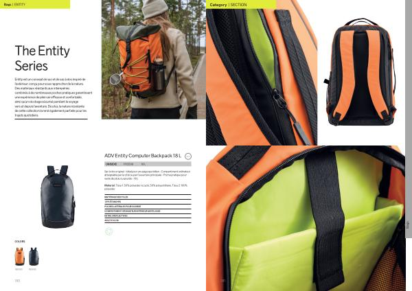Entity est un concept de sac et de sac à dos inspiré de l ’ extérieur , conçu pour vous rapprocher de la nature . Des matériaux résistants aux intempéries combinés à de nombreuses poches pratiques garantissent une expérience de plein air efficace et confortable , ainsi qu ’ un stockage sécurisé pendant le voyage vers et depuis l ’ aventure . De plus , la nature résistante de cette collection la rend également parfaite pour les trajets quotidiens .