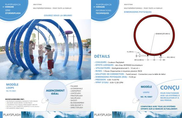 JEUX D ' EAU PLAYSPLASH . CA SOMMAIRE DIMENSIONS PHYSIQUES INFORMATIONS TECHNIQUES MULTIGÉNÉRATIONNELS LA FAMILLE ! POUR TOUTE - MODÈLE PLAYSPLASH OPS ! LO NO . PS . 18007 CONÇU • • • • • • • • GPM 12 8.00 – . 00 DÉBIT D ’ EAU : PSI 6.00 – 15.00 PRESSION : po 72.00 : DIA DIMENSIONS PHYSIQUES ( ) béton de dalle la sous C - TwistConnect onnection CONNECTION : SOLUTION DE pression INOX moyenne à Dispersantes Buses 5 BUSES : + et ans 14 – 0 Multigénérationnel UTILISATEURS : brumisateurs d ' eau INTENSES Jets EFFETS LUDIQUES : PlaySplash Couleurs COULEURS : DÉTAILS POUR EAU PERDUE . RECIRCULATION ET À AVEC LES SYSTÈMES À FONCTIONNER COMPATIBLE ACTUELLEMENT . MARCHÉ OFFERTS SUR LE AVEC TOUS LES SYSTÈMES