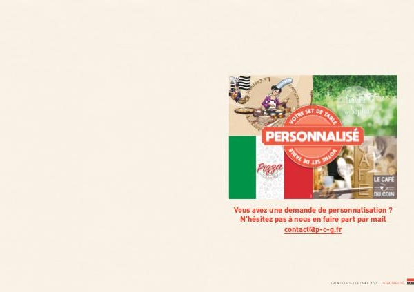 Vous avez une demande de personnalisation ? N’hésitez pas à nous en faire part par mail contact@p-c-g.fr CATALOGUE SET DE TABLE 2020 I PERSONNALISÉ 5