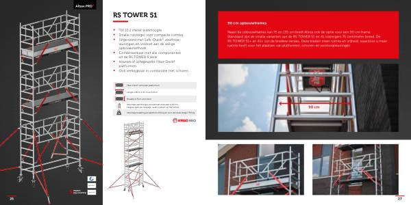 Naast de opbouwframes van 75 en 135 cm biedt Altrex ook de optie voor een 90 cm frame . Standaard zijn de smalle varianten van de RS TOWER 51 en 41 rolsteigers 75 centimeter breed . De RS TOWER 51 + en 41 + zijn de bredere versies . Deze bieden meer ruimte en vrijheid , waardoor u meer ruimte heeft voor het plaatsen van platformen , schoren én voorloopleuningen .