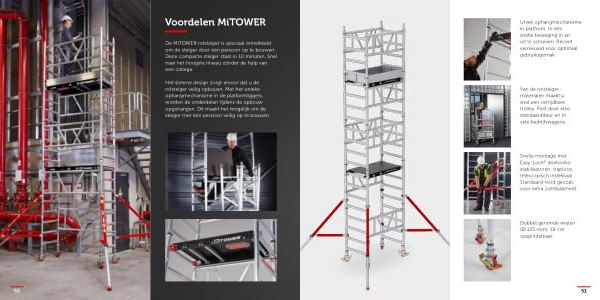 De MiTOWER rolsteiger is speciaal ontwikkeld om de steiger door één persoon op te bouwen . Deze compacte steiger staat in 10 minuten . Snel naar het hoogste niveau zónder de hulp van een collega .