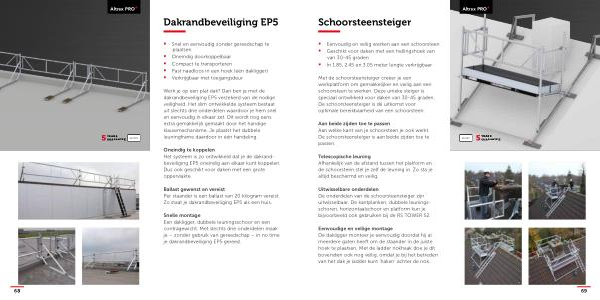 Werk je op een plat dak ? Dan ben je met de dakrandbeveiliging EP5 verzekerd van de nodige veiligheid . Het slim ontwikkelde systeem bestaat uit slechts drie onderdelen waardoor je hem snel en eenvoudig in elkaar zet . Dit wordt nog eens extra gemakkelijk gemaakt door het handige klauwmechanisme . Je plaatst het dubbele leuningframe daardoor in één handeling .