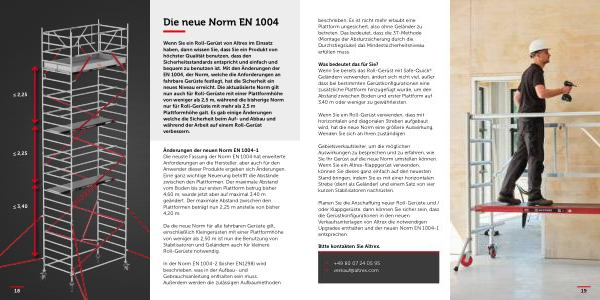 Wenn Sie ein Roll-Gerüst von Altrex im Einsatz haben , dann wissen Sie , dass Sie ein Produkt von höchster Qualität benutzen , dass den Sicherheitsstandards entspricht und einfach und bequem zu benutzen ist . Mit den Änderungen der EN 1004 , der Norm , welche die Anforderungen an fahrbare Gerüste festlegt , hat die Sicherheit ein neues Niveau erreicht . Die aktualisierte Norm gilt nun auch für Roll-Gerüste mit einer Plattformhöhe von weniger als 2,5 m , während die bisherige Norm nur für Roll-Gerüste mit mehr als 2,5 m Plattformhöhe galt . Es gab einige Änderungen welche die Sicherheit beim Auf- und Abbau und während der Arbeit auf einem Roll-Gerüst verbessern .