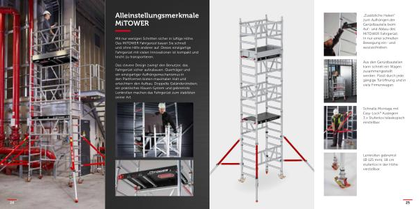 Mit nur wenigen Schritten sicher in luftige Höhe . Das MiTOWER Fahrgerüst bauen Sie schnell und ohne Hilfe anderer auf . Dieses einzigartige Fahrgerüst mit vielen Innovationen ist kompakt und leicht zu transportieren .