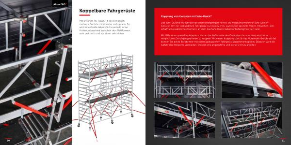 Das Safe-Quick ® -Rollgerüst hat einen einzigartigen Vorteil : die Kopplung mehrerer Safe-Quick ® - Gerüste . Um ein verbundenes Fahrgerüst zu konstruieren , wurde eine spezielle Stütze entwickelt . Dies schafft ein zusätzliches Element , an dem das Safe-Quick Geländer befestigt werden kann .