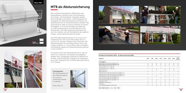 Die modulare Dreieckbühne ( MTB ) bietet viele Anwendungen und kann auch als Schutzgerüst für Schräg- und Flachdächer eingesetzt werden . Die Kombination aus Arbeits- und Schutzgerüst ist einzigartig . Für diese Anwendung sind Stützen und Geländerrahmen mit Sicherheitsnetzen erhältlich . Die Anwendung ist ideal für sicheres Arbeiten auf einem Schrägdach , z . B . bei der Montage und Wartung von Dacheindeckungen , Sonnenkollektoren und Dachfenstern . Die Dachrandsicherung eignet sich auch für Arbeiten , die auf Flachdächern durchgeführt werden , da der Dachrand dann frei bleibt .