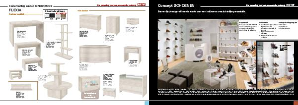 • Toonbank « Receptio », L 56 x D 62 x H 111 cm, ref. 46377 • Toonbank hoek « Receptio », L 60 x D 60 x H 96 cm, ref. 46381 • Steun legbord, L 30 cm, 25 x ref. 46635 • Legbord, 35 x 20 cm, 25 x ref. 46785 • Lamellenwand wit, 120 x 120 cm, groef elke 15 cm, ref. 45181 • Rail aluminium, L 120 cm, 7 x ref. 44132 • Legbord plexi, 3 x ref. 40780 • Ophangbeugel buste lamellenwand, 6 x ref. 45556 • Schapdragers, 34 cm, per 2, 18 x ref. 43706 • Kit van 2 legborden, wit gelakt, 9 x ref. 45076 • Set van 3 tafels wit gelakt, L 39, L 49,