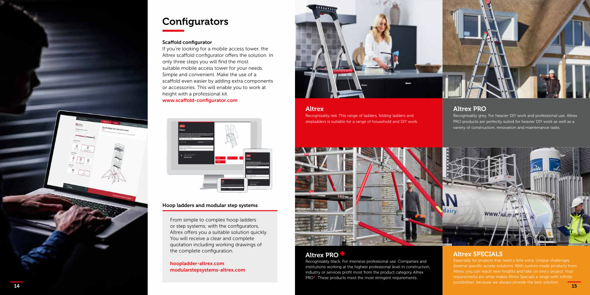 Scaffold configurator If you’ re looking for a mobile access tower, the Altrex scaffold configurator offers the solution. In only three steps you will find the most suitable mobile access tower for your needs. Simple and convenient. Make the use of a scaffold even easier by adding extra components or accessories. This will enable you to work at height with a professional kit. www. scaffold-configurator. com