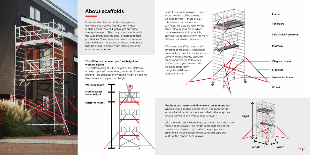 From standard to special. For every job and every project, you will find the right Altrex Mobile access towers. Lightweight and super strong aluminium. The many components within the wide product range ensure unprecedented possibilities. You create your own customisation: a double width mobile access tower or modular triangle bridge, a single width folding tower or an extension console.
