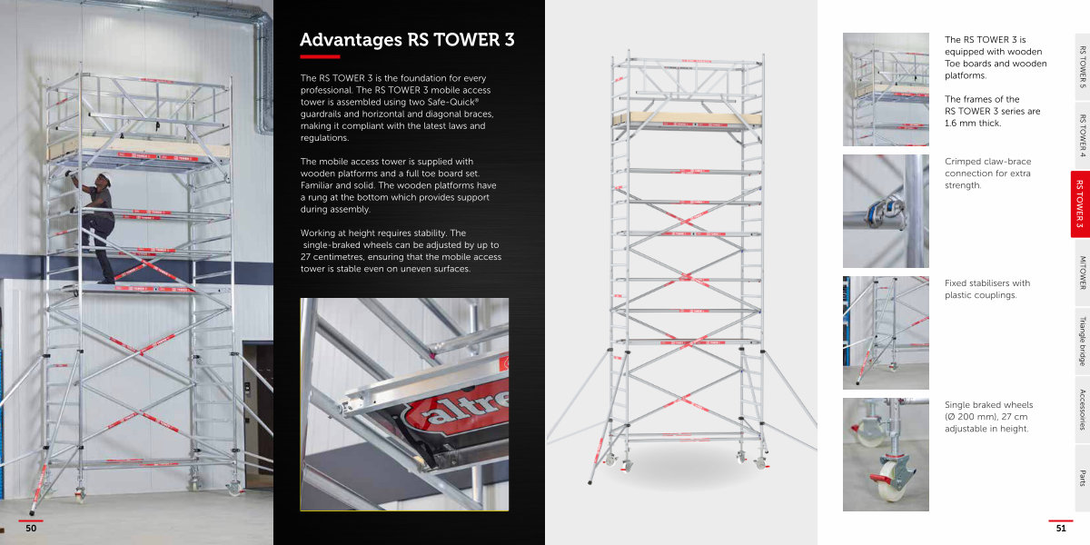 The RS TOWER 3 is the foundation for every professional. The RS TOWER 3 mobile access tower is assembled using two Safe-Quick ® guardrails and horizontal and diagonal braces, making it compliant with the latest laws and regulations.