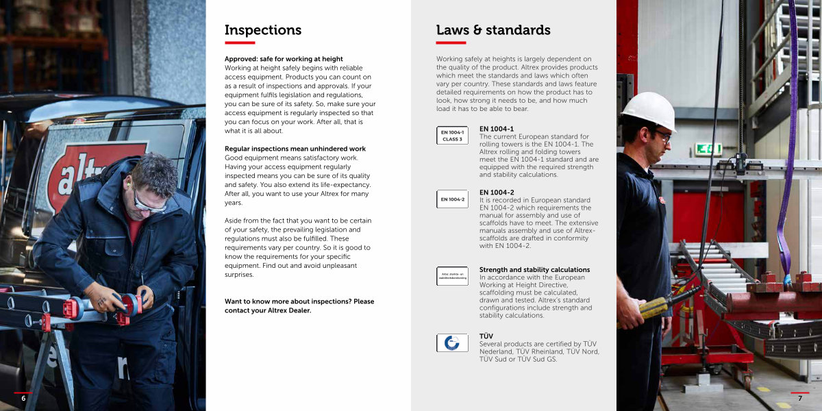 Working safely at heights is largely dependent on the quality of the product. Altrex provides products which meet the standards and laws which often vary per country. These standards and laws feature detailed requirements on how the product has to look, how strong it needs to be, and how much load it has to be able to bear.