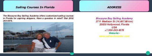 ADDRESS Biscayne Bay Sailing Academy 2711 Madison St (14,667.88 km) 33020 Hollywood, Florida USA +1 954-243-4078 Website:- www.sailventuresinc.com