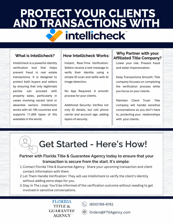 Partner with Florida Title & Guarantee Agency today to ensure that your transaction is secure from the start. It’ s simple: 1. Contact Florida Title & Guarantee Agency: Share your upcoming transaction and client