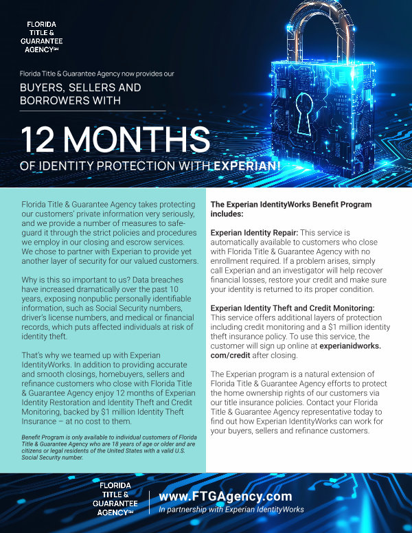 That’ s why we teamed up with Experian IdentityWorks. In addition to providing accurate and smooth closings, homebuyers, sellers and refinance customers who close with Florida Title & Guarantee Agency enjoy 12 months of Experian Identity Restoration and Identity Theft and Credit Monitoring, backed by $ 1 million Identity Theft Insurance – at no cost to them.