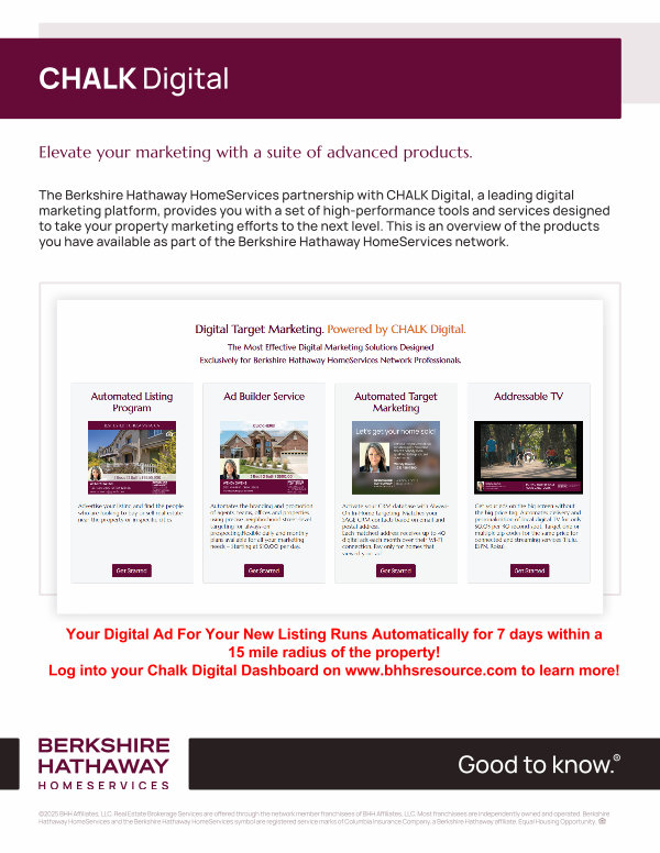 Your Digital Ad For Your New Listing Runs Automatically for 7 days within a 15 mile radius of the property! Log into your Chalk Digital Dashboard on www. bhhsresource. com to learn more!