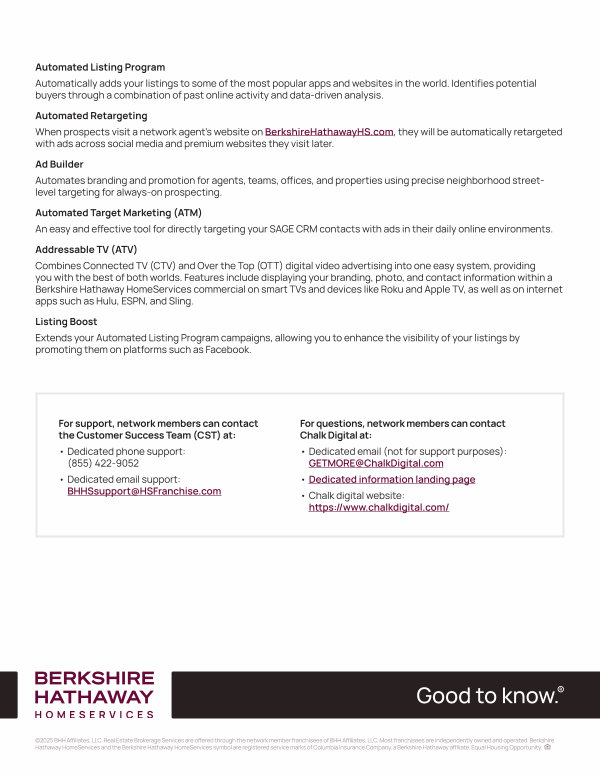 Combines Connected TV( CTV) and Over the Top( OTT) digital video advertising into one easy system, providing you with the best of both worlds. Features include displaying your branding, photo, and contact information within a Berkshire Hathaway HomeServices commercial on smart TVs and devices like Roku and Apple TV, as well as on internet apps such as Hulu, ESPN, and Sling.