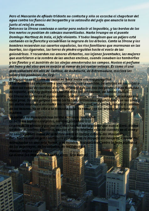 La Sirena se estira en el agua quieta. Lentamente, angustiosamente, se enlaza a la vieja proa. Su cola golpea contra las tablas carcomidas. Ayudándose con las uñas y las aletas empieza a ascender hacia el Mascarón que, allá arriba, señala el camino de los tesoros. Ya se ciñe a la ménsula rota. Ya rodea con los brazos la cintura de madera.