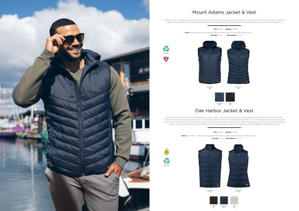 Men: Women: Oak Harbor Jacket & Vest embrace the perfect balance of warmth, style, and eco-consciousness. The stretch-polyester sleeves and sides offer complete comfort. The quilted front and back panels feature insulation using Sustans ® padding made from renewable fibers by DuPont™ Sorona ®. The ladies ' jacket boasts a hood, while the men ' s version has a collar. Both come with full zips and auto-lock zip-pullers on the front and pockets. These versatile pieces can be worn solo for dry conditions or layered under a rain protective shell for extra warmth. The vest is a great addition, perfect for layering over an Oakville sweater or the Traverse Half Zip.