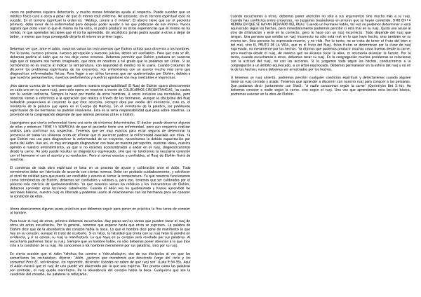 Supongamos que cierta enfermedad tiene una serie de síntomas determinados . El doctor puede observar algunos de ellos y entonces TIENE LA SOSPECHA de que el paciente tiene una enfermedad , pero aun requerirá realizar análisis para confirmar sus sospechas . Tenemos que ser muy exactos para estar seguros de determinar la presencia de todos los síntomas antes de afirmar que el paciente padece la enfermedad asociada con ellos . Ya que Elohim nos usa para diagnosticar la enfermedad de un creyente , necesitamos la debida capacitación por parte del Adón . Aun así , es muy arriesgado diagnosticar con base en nuestra percepción , nuestras ideas , nuestra opinión o nuestro entendimiento , ya que si no estamos acostumbrados a andar en el ruaj , diagnosticaremos desde la carne . No sólo puede resultar un diagnóstico equivocado , sino que no tendremos la necesaria conexión con el hermano ni con el asunto y su resolución . Pero si somos exactos y confiables , el Ruaj de Elohim fluirá de nosotros .