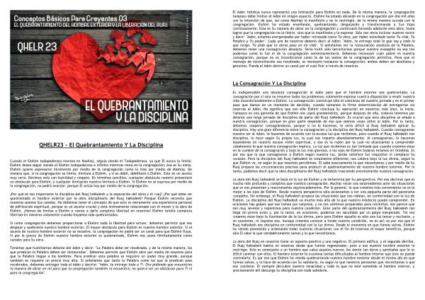 Es indispensable una absoluta consagración al Adón para que el hombre exterior sea quebrantado . La consagración por sí sola no resuelve todos los problemas ; solamente expresa nuestra disposición a rendir nuestra vida incondicionalmente a Elohim . La consagración constituye sólo el comienzo de nuestra jornada y es el primer paso que damos en un momento de decisión , cuando tomamos la firme determinación de entregarnos sin reservas al Adón . No significa que con ella Elohim concluya Su operación en nosotros ; más bien , la inicia . Tampoco es una garantía de que Elohim nos usará grandemente , porque después de ella , todavía tenemos por delante una larga jornada de disciplina de parte del Ruaj haKodesh . Es crucial que esta disciplina se añada a nuestra consagración , porque en gran parte depende de eso que seamos vasos útiles al Adón . Por lo tanto , debemos cooperar consagrándonos , porque si no lo hacemos , le sería difícil al Ruaj haKodesh aplicar Su disciplina . Hay una gran diferencia entre la consagración y la disciplina del Ruaj haKodesh . Cuando consagramos nuestro ser al Adón , lo hacemos de acuerdo con la escasa luz que recibimos , pero cuando el Ruaj haKodesh nos disciplina , lo hace según Su propia luz , la cual nos imparte abundantemente . Al consagrarnos , lo hacemos basándonos en nuestra escasa visión espiritual , y ésa es la razón por la cual no alcanzamos a comprender cabalmente lo que nuestra consagración implica . La luz que recibimos es tan limitada que cuando creemos estar en la cumbre de la consagración y bajo la luz más gloriosa , a los ojos de Elohim todavía estamos en tinieblas . Es por eso que lo que consagramos a Elohim según nuestra luz , jamás satisface Sus requisitos ni complace Su corazón . Pero la disciplina del Ruaj haKodesh es totalmente diferente ; nos calibra bajo la luz divina , según lo que Elohim ve , no según lo que nosotros percibimos . Él sabe exactamente lo que necesitamos y por medio de Su Ruaj prepara las circunstancias precisas para producir el quebrantamiento de nuestro hombre exterior . Por lo tanto , podemos decir que la obra disciplinaria del Ruaj haKodesh trasciende enormemente nuestra consagración .