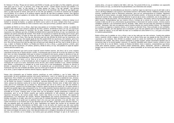 Elohim afirma que Su palabra es viva y eficaz y que no hay nada que sea más cortante . Cuando esta palabra viene a nosotros , divide y separa el alma del ruaj , de la misma forma que una espada de dos filos divide las coyunturas y los tuétanos . Esta división se produce cuando se ponen de manifiesto los pensamientos y las intenciones del corazón . Muy pocos conocen realmente su propio corazón , porque únicamente aquellos que se encuentran bajo la luz divina pueden conocerlo . El requisito ineludible para conocer nuestro corazón es estar bajo el brillo de la luz de Elohim . Cuando la Palabra de Elohim viene a nosotros , comprendemos que hemos vivido para nosotros mismos y para nuestra propia satisfacción , gloria , realización , posición y edificación . Siempre que la luz de Elohim manifiesta nuestro yo , somos humillados de tal forma que caemos postrados ante el Adón .