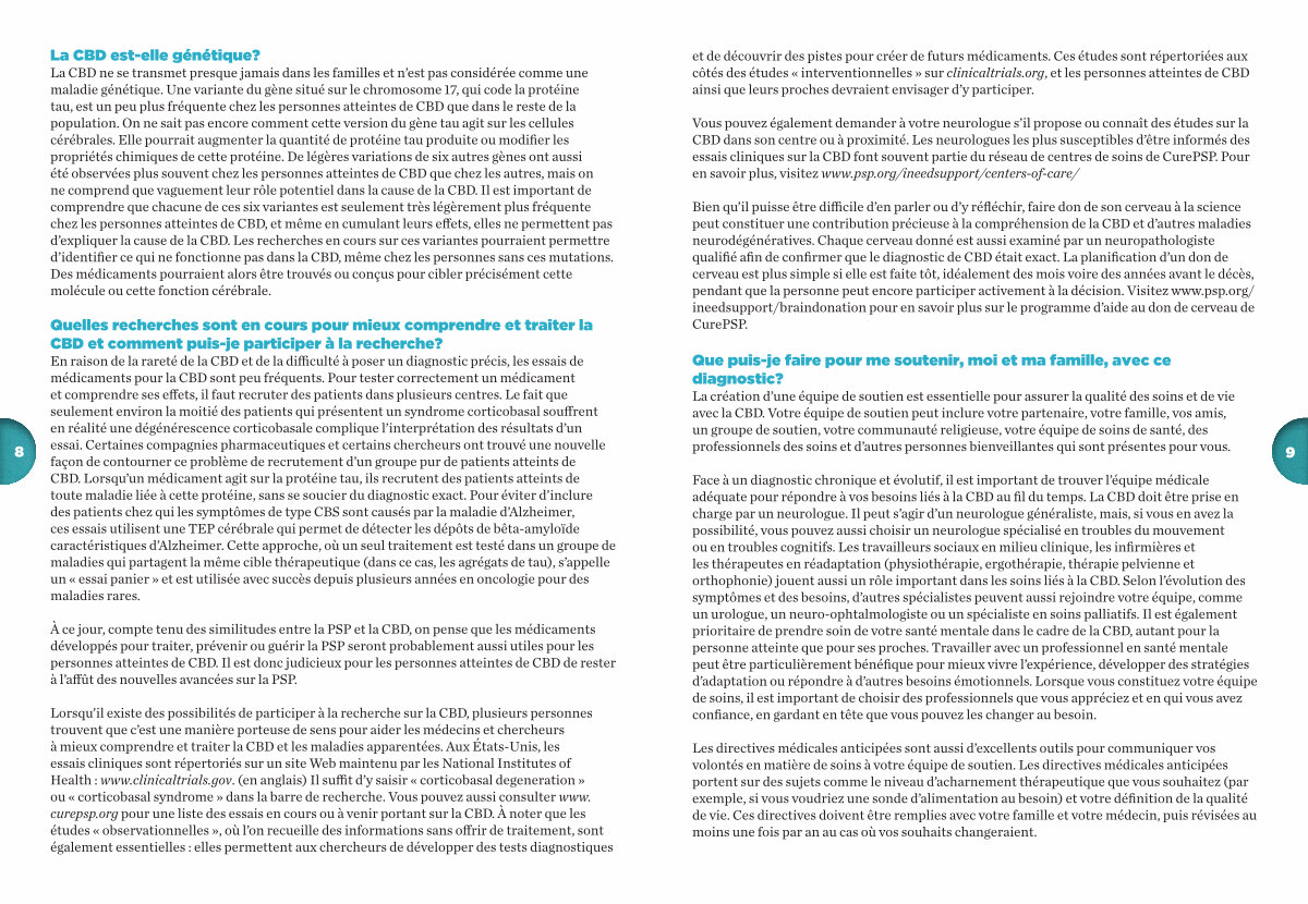 À ce jour, compte tenu des similitudes entre la PSP et la CBD, on pense que les médicaments développés pour traiter, prévenir ou guérir la PSP seront probablement aussi utiles pour les personnes atteintes de CBD. Il est donc judicieux pour les personnes atteintes de CBD de rester à l’ affût des nouvelles avancées sur la PSP.