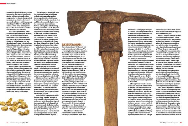 Mercury was used in the separation of gold from rock : Gold dissolves in mercury , and then the solution is boiled , vaporizing the mercury and leaving the gold behind . Mercury was especially prevalent with hydraulic mining . According to the USGS , “ Mercury was used to enhance gold recovery in all the various types of mining operations ; historical records indicate that more mercury was used and lost at hydraulic mines than at other types of mines .” Court injunctions began restricting hydraulic mining in 1884 , with North Bloomfield Gravel Mining Company at the center of lawsuits against excessive debris and damage to farmland . ( The site of North Bloomfield ’ s largest mine , Malakoff Diggins , is now a state historic park .)