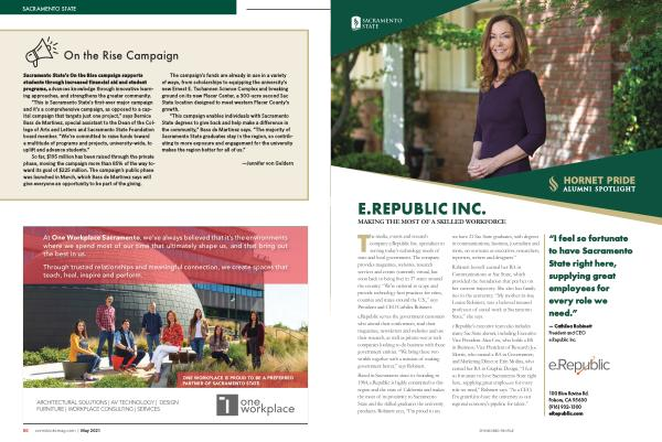 Based in Sacramento since its founding in 1984 , e . Republic is highly committed to this region and the state of California and makes the most of its proximity to Sacramento State and the skilled graduates the university produces . Robinett says , “ I ’ m proud to say we have 21 Sac State graduates , with degrees in communications , business , journalism and more , on our team as executives , researchers , reporters , writers and designers .”