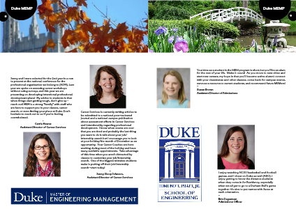 Jenny and I were selected for the 2nd year in a row to present at the national conference for the professional organization we belong to (ACPA). Last year we spoke on assessing career workshops without using surveys, and this year we are presenting on developing intentional professional development plans! My advice to students is that when things start getting tough, don't give up - reach out! MEM is a strong "family" with staff who are here to support you in your classes, career search, or even finding your place at Duke. Don't hesitate to reach out to us if you're feeling overwhelmed.