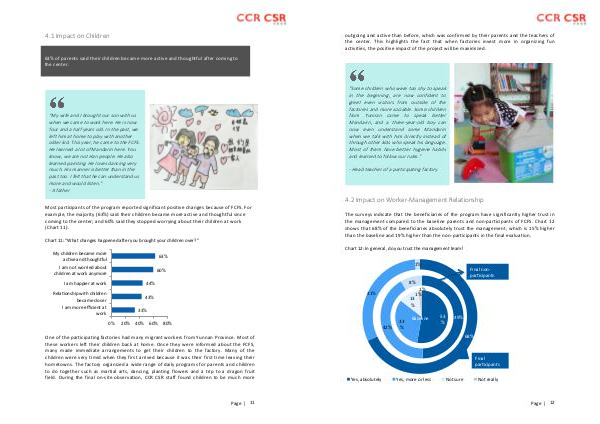 One of the participating factories had many migrant workers from Yunnan Province. Most of these workers left their children back at home. Once they were informed about the FCFS, many made immediate arrangements to get their children to the factory. Many of the children were very timid when they first arrived because it was their first time leaving their hometowns. The factory organized a wide range of daily programs for parents and children to do together such as martial arts, dancing, planting flowers and a trip to a dragon fruit field. During the final on-‐ site observation, CCR CSR staff found children to be much more