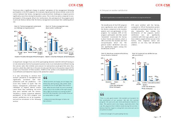 97 % were satisfied with the factory, compared to 79 % of the baseline parents and 88 % non-‐ participants( Chart 16). It is also noteworthy that among the beneficiaries of the program, worker satisfaction was not significantly correlated with their age, gender, age of their children, length of their service in the factory, their migration status and whether or not they had left-‐ behind children.
