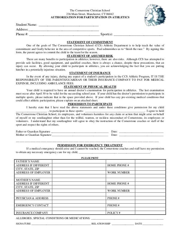 AUTHORIZATION FOR PARTICIPATION IN ATHLETICS