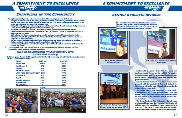 Central held its annual Senior Athletic Awards and Academic Awards Banquet on May 4, 2016. The evening honored the Blue Devils’ senior student-athletes along with athletic trainers, cheerleaders, dance team members and pep band members. Seniors Makenna Lommori and Jamal Fruster were presented with the coveted Gail Rutz and Frederick M. Gladstone awards as the most outstanding female and male student-athletes, respectively. The evening also included recognition for the academic accomplishments of CCSU’ s student-athletes. Over 100 student-athletes earned Academic Awards, and furthermore 63 were named to the Travelers Athletic Director’ s All- Academic Team. The Collegiate Athlete Peer Ambassadors( CAPA) group of student-athletes was also presented the Director of Athletics Award for exemplifying“ what it means to be a Blue Devil.” The award is given only when the Athletic Director determines it has been earned during a school year.