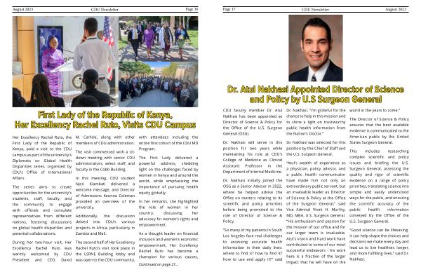 Her Excellency Rachel Ruto , the First Lady of the Republic of Kenya , paid a visit to the CDU campus as part of the university ’ s Diplomats on Global Health Disparities series , organized by CDU ’ s Office of International Affairs .