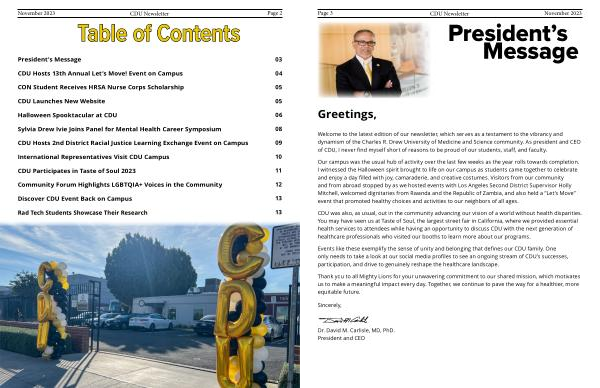 Welcome to the latest edition of our newsletter , which serves as a testament to the vibrancy and dynamism of the Charles R . Drew University of Medicine and Science community . As president and CEO of CDU , I never find myself short of reasons to be proud of our students , staff , and faculty .