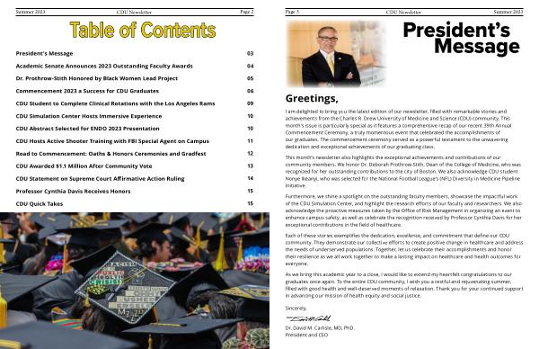 I am delighted to bring you the latest edition of our newsletter , filled with remarkable stories and achievements from the Charles R . Drew University of Medicine and Science ( CDU ) community . This month ’ s issue is particularly special as it features a comprehensive recap of our recent 39th Annual Commencement Ceremony , a truly momentous event that celebrated the accomplishments of our graduates . The commencement ceremony served as a powerful testament to the unwavering dedication and exceptional achievements of our graduating class .