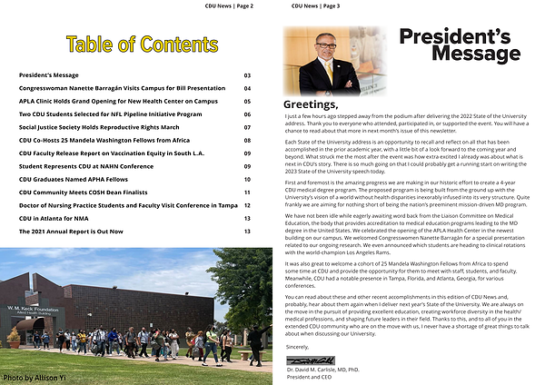 You can read about these and other recent accomplishments in this edition of CDU News and , probably , hear about them again when I deliver next year ’ s State of the University . We are always on the move in the pursuit of providing excellent education , creating workforce diversity in the health / medical professions , and shaping future leaders in their field . Thanks to this , and to all of you in the extended CDU community who are on the move with us , I never have a shortage of great things to talk about when discussing our University .