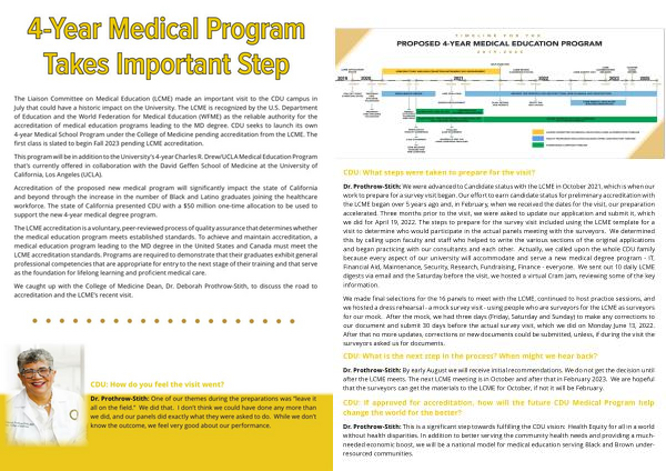 Dr . Prothrow-Stith : This is a significant step towards fulfilling the CDU vision : Health Equity for all in a world without health disparities . In addition to better serving the community health needs and providing a muchneeded economic boost , we will be a national model for medical education serving Black and Brown underresourced communities .