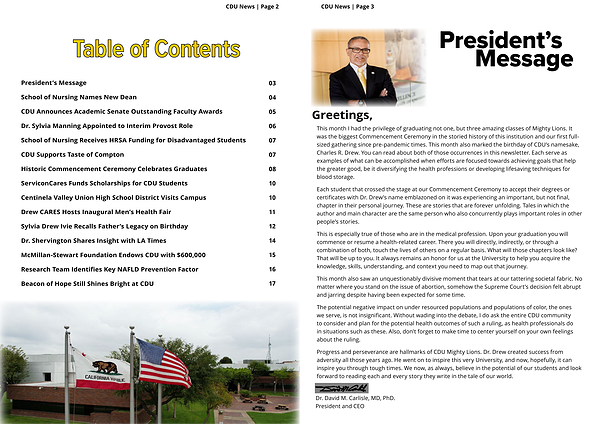 This month I had the privilege of graduating not one , but three amazing classes of Mighty Lions . It was the biggest Commencement Ceremony in the storied history of this institution and our first fullsized gathering since pre-pandemic times . This month also marked the birthday of CDU ’ s namesake , Charles R . Drew . You can read about both of those occurrences in this newsletter . Each serve as examples of what can be accomplished when efforts are focused towards achieving goals that help the greater good , be it diversifying the health professions or developing lifesaving techniques for blood storage .