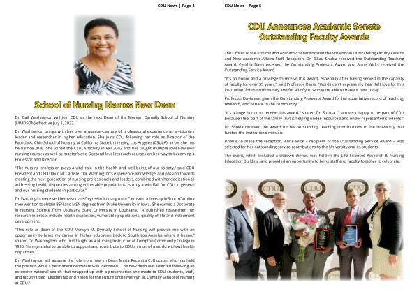 “ This role as dean of the CDU Mervyn M . Dymally School of Nursing will provide me with an opportunity to bring my career in higher education back to South Los Angeles where it began ,” shared Dr . Washington , who first taught as a Nursing Instructor at Compton Community College in 1996 . “ I am grateful to be able to support and contribute to CDU ’ s vision of a world without health disparities .”