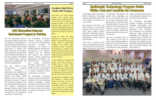 The CDU Biomedical Sciences The Biomedical Enrichment Enrichment Program : Mentoring Program immerses students and Workforce Development is in a structured comprehensive underway and providing cohorts curriculum designed for of COSH students with a unique preparation for careers in opportunity to expand their BioMed / BioTech . Through their career potential . The program , participation in the program , which kicked off in October 2022 , students will be matched seeks to expose CDU students to with industry and research the various fields of Biomedical mentors , attend professional and Biotechnology research , development workshops and professional development , and biotech / biomed conferences , workforce development . and receive workforce / internship opportunities . The The first “ cohort ” of the inaugural cohort will conclude 10-month-long program its first year by participating in currently underway is a research symposium poster composed of 22 students from presentation in July 2023 . the Undergraduate Biomedical Sciences and Public Health The Biomedical Enrichment Program and the Master ’ s in Program is a part of a 5-year grant Biomedical Sciences Program . funded by the Chan Zuckerberg The enrichment program is led Initiative Foundation . Hologic by COSH Dean Dr . Monica Ferrini and Kaiser Permanente are also and Program Development sponsors . The program leaders Manager Brittney Miller along are intent to seek more funding with Program Faculty Dr . Silvana to continue the program in the Constatinescu , and Laboratory future . Coordinator Thalia Jiminez .