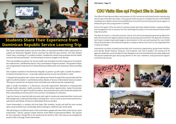 The Office of International Affairs and members of CDU ’ s technical staff visited Zambia , representing the US-base of the Rise Up ! Project . The purpose of the visit was to complete the aims of the PEPFAR funded grant to deliver Human Immunodeficiency Virus ( HIV ) services and psychosocial support to adolescent girls and young women in Zambia .