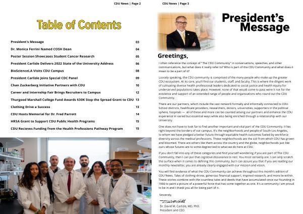 President ’ s Message Dr . Monica Ferrini Named COSH Dean Poster Session Showcases Student Cancer Research President Carlisle Delivers 2022 State of the University Address BioScienceLA Visits CDU Campus President Carlisle Joins Special CDC Panel Chan Zuckerberg Initiative Partners with CDU Career and Internship Fair Brings Recruiters to Campus Thurgood Marshall College Fund Awards $ 30K Stop the Spread Grant to CDU Clothing Drive a Success CDU Hosts Memorial for Dr . Fred Parrott HRSA Grant to Support CDU Public Health Programs CDU Recieves Funding from the Health Professions Pathway Program