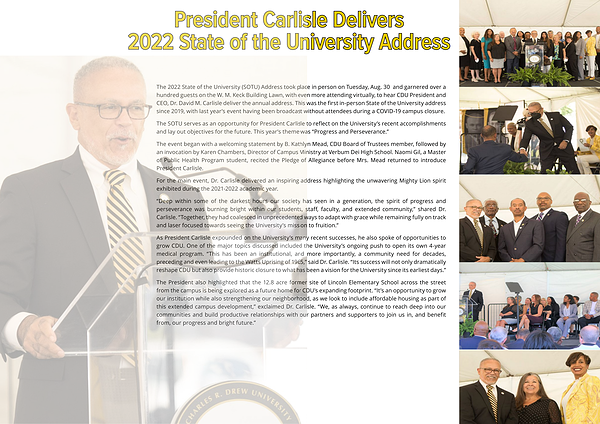 lace in person on Tuesday , Aug . 30 and garnered over a ven more attending virtually , to hear CDU President and is was the first in-person State of the University address t without attendees during a COVID-19 campus closure .