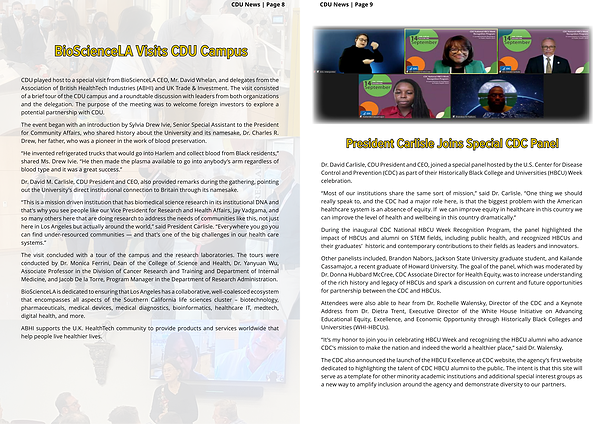CDU played host to a special visit from BioScienceLA CEO , Mr . David Whelan , and delegates from the Association of British HealthTech Industries ( ABHI ) and UK Trade & Investment . The visit consisted of a brief tour of the CDU campus and a roundtable discussion with leaders from both organizations and the delegation . The purpose of the meeting was to welcome foreign investors to explore a potential partnership with CDU .