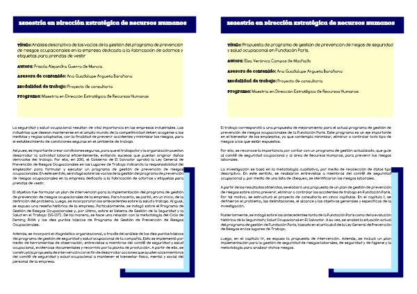 Posteriormente, se indagó sobre los antecedentes tanto de la Fundación París como de la evolución histórica de la Seguridad y Salud Ocupacional en El Salvador. A su vez, se analizó la situación actual del programa de gestión de Fundación París, basado en el artículo 8 de la Ley General de Prevención de Riesgos en los lugares de Trabajo.